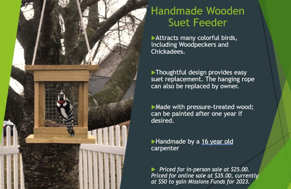 This handmade wooden suet feeder attracts many colorful birds. The thoughtful design allows for easy suet replacement. This suet feeder sells, unpainted, for $50.00 — this is the Missions Fundraising Price – thank you for contributing to this great cause! Allow 2 – 3 weeks for delivery after order is completed. Thank you!